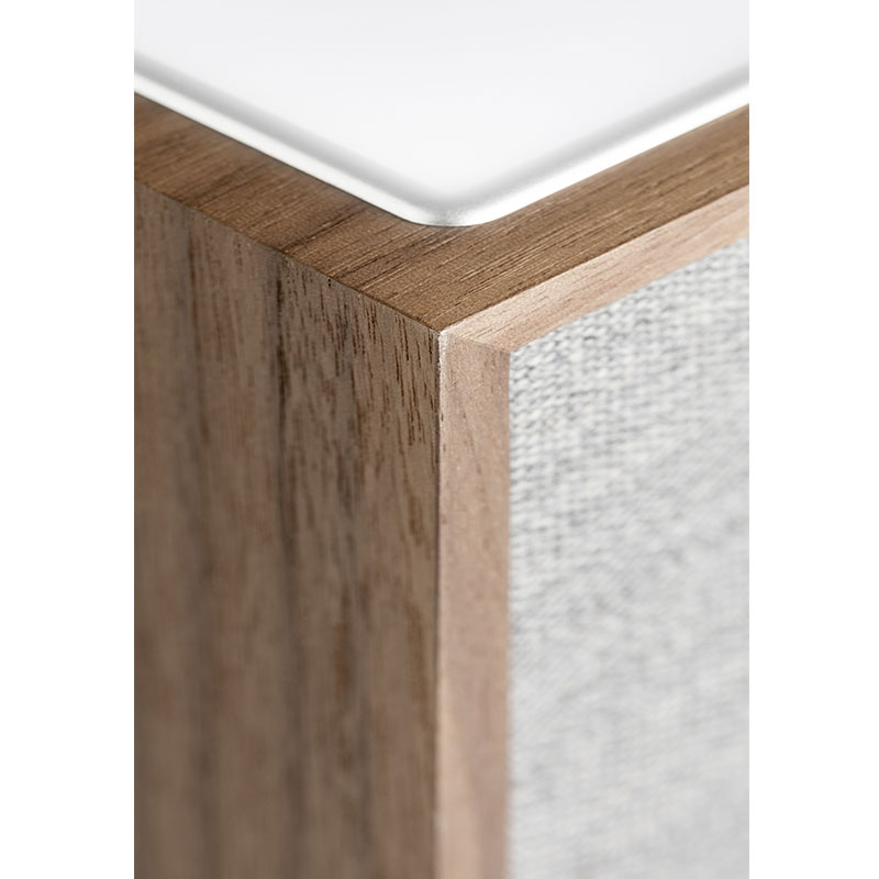 上質な家具水準のウッドを使用した温かみのあるデザインは、スピーカーのグリルにはデンマークのガブリエル製高級ファブリックを使用し、シンプルな立方体デザインは、インテリアとしても目を惹きます。