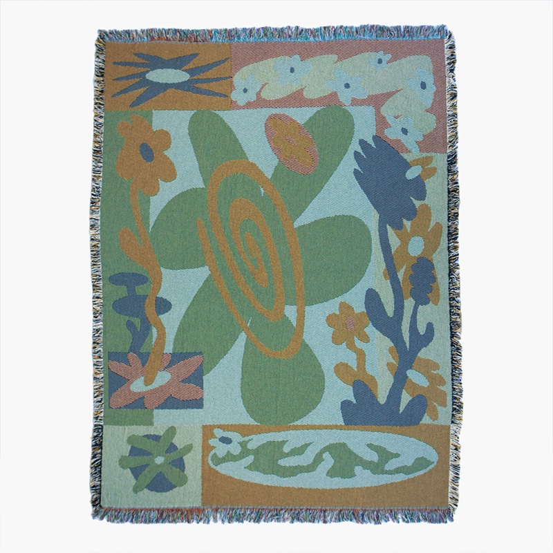 ブランドの代表的なアイテムであるブランケットは、大胆な色使いとポップな絵柄が特徴。